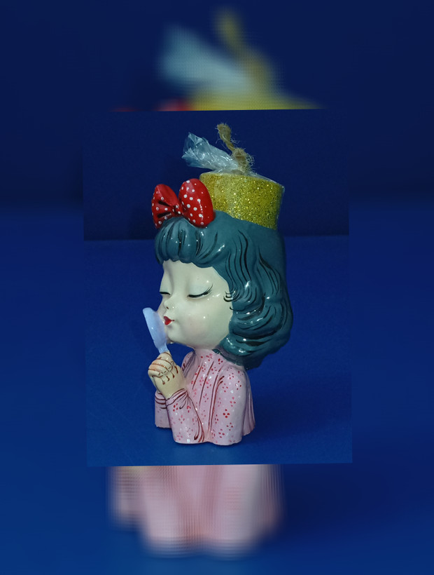 اینجا شمعی از گچ ساخته شده و مزین به نقاشی مینیاتور و پلی استر دو مواد تابا میباشد