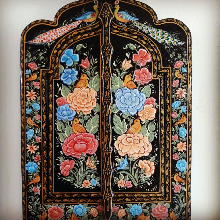 منقش به هنر نگارگری و از جنس چوب همراه آستری از روغن جلای و برزک و قابل تبدیل به جاکلیدی درب خروجی محل